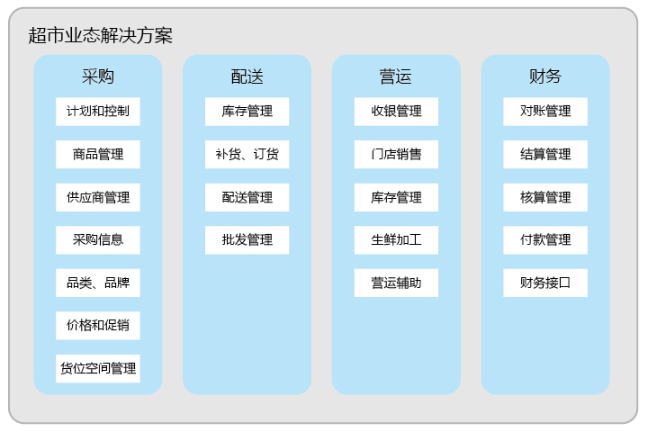 其中包括高效的采购、OPL自动补货、配送、营运流程支持,以采购为主导,注重对商品的精细管控,支持对单品的全批次管理,灵活的生鲜加工管理方案。提供完善的会员管理功能,支持灵活多样的促销模式,并完成促销的全程管控。支持总部集中的管理模式,强化总部管控能力,简化门店营运流程。注重商品、品类、货位、生鲜加工、库存、合同、费用等细节管控,处处体现着精细管理的理念。另外,还着重于品类基础上的分析和管控。